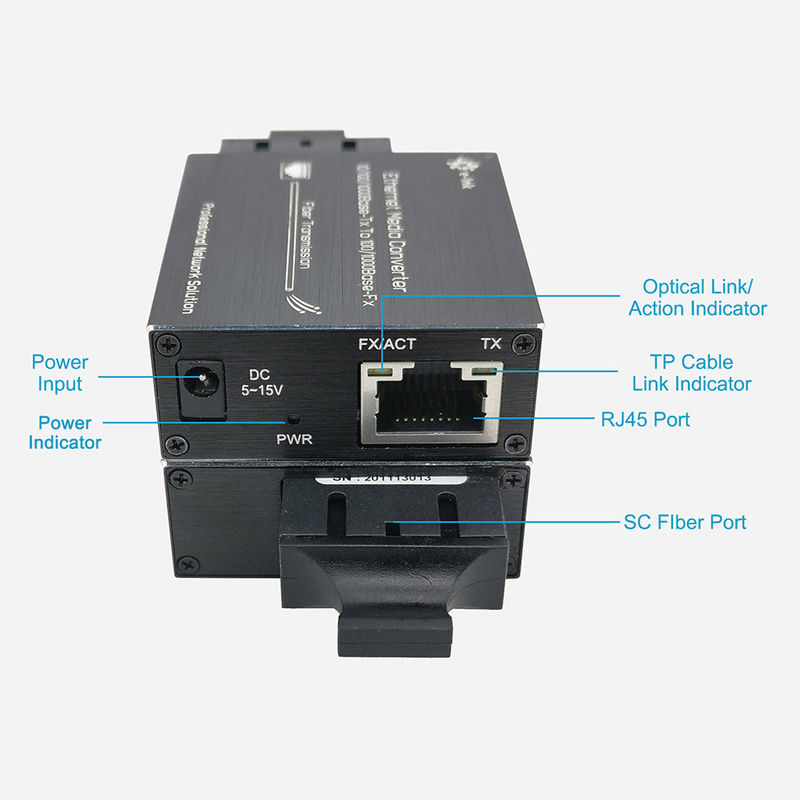 Επί του παρόντος υποστηρίζει δύο τύπους συνδέσεων δικτύου μέσων ενημέρωσης: 10Base-T/100Base-TX/1000Base-T και 100/1000Base-SX/LX,Μετατροπή ηλεκτρικών σημάτων 10Base-T/100Base-TX/1000Base-T διεστραμμένων ζευγαριών με οπτικά σήματα 100/1000Base-SX/LX• Επεκτείνει την απόσταση μετάδοσης του δικτύου από 100 μέτρα μέσω καλωδίου χαλκού έως 20 χλμ. (έως 120 χλμ.) μέσω καλωδίων οπτικών ινών.